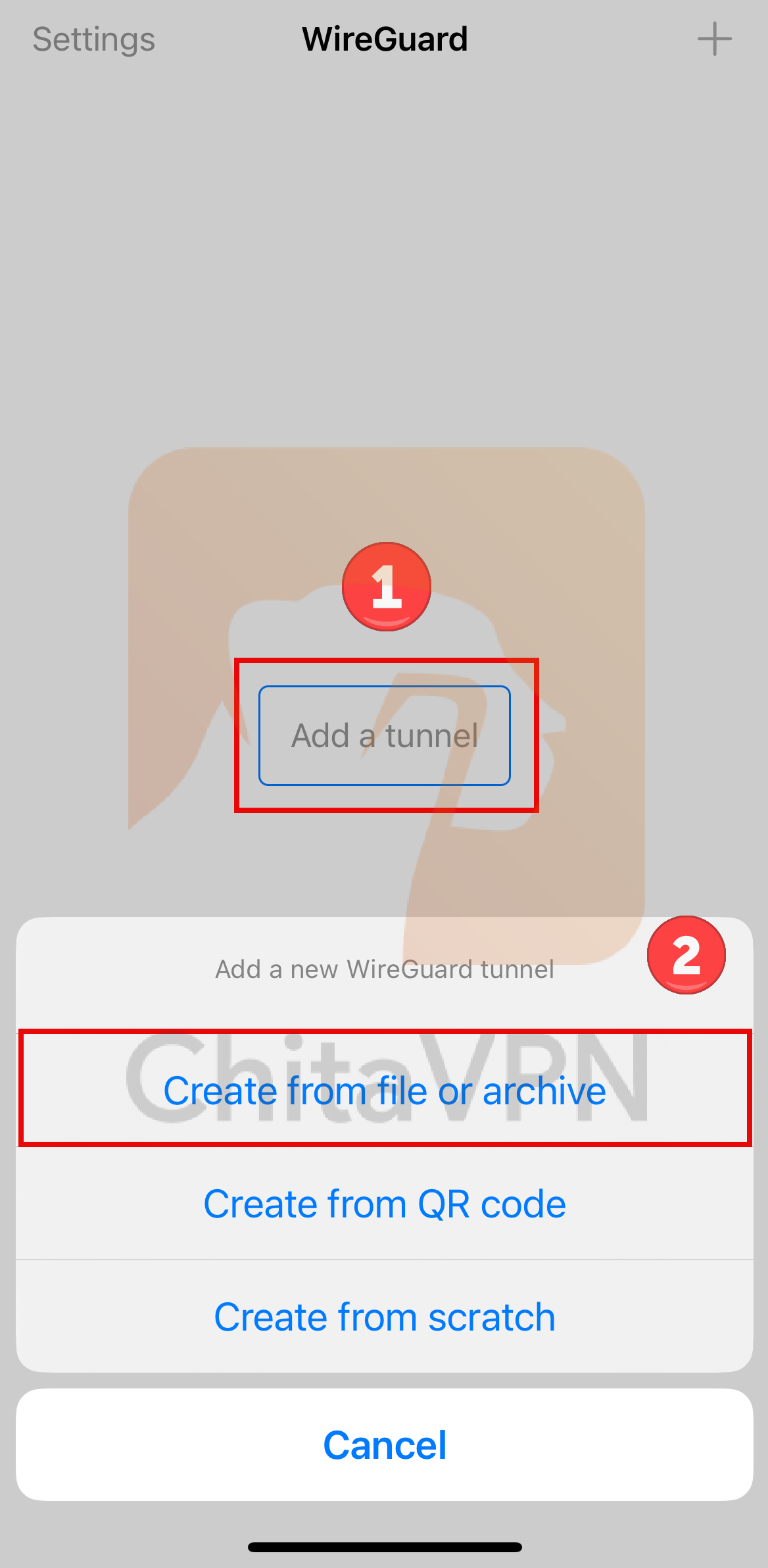 1. After launching the app, click on "Add a Tunnel" and then choose "Create from file or archive" to import ChitaVPN configuration file.