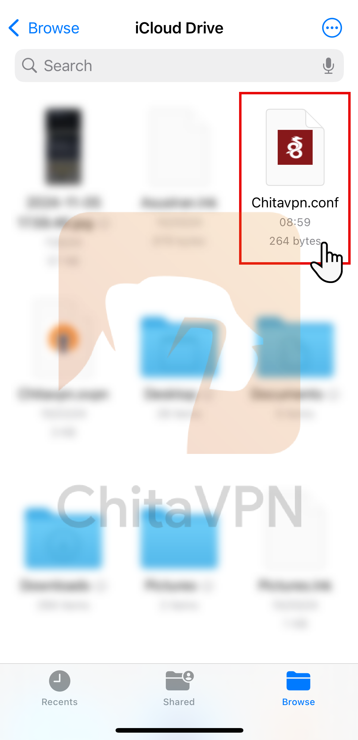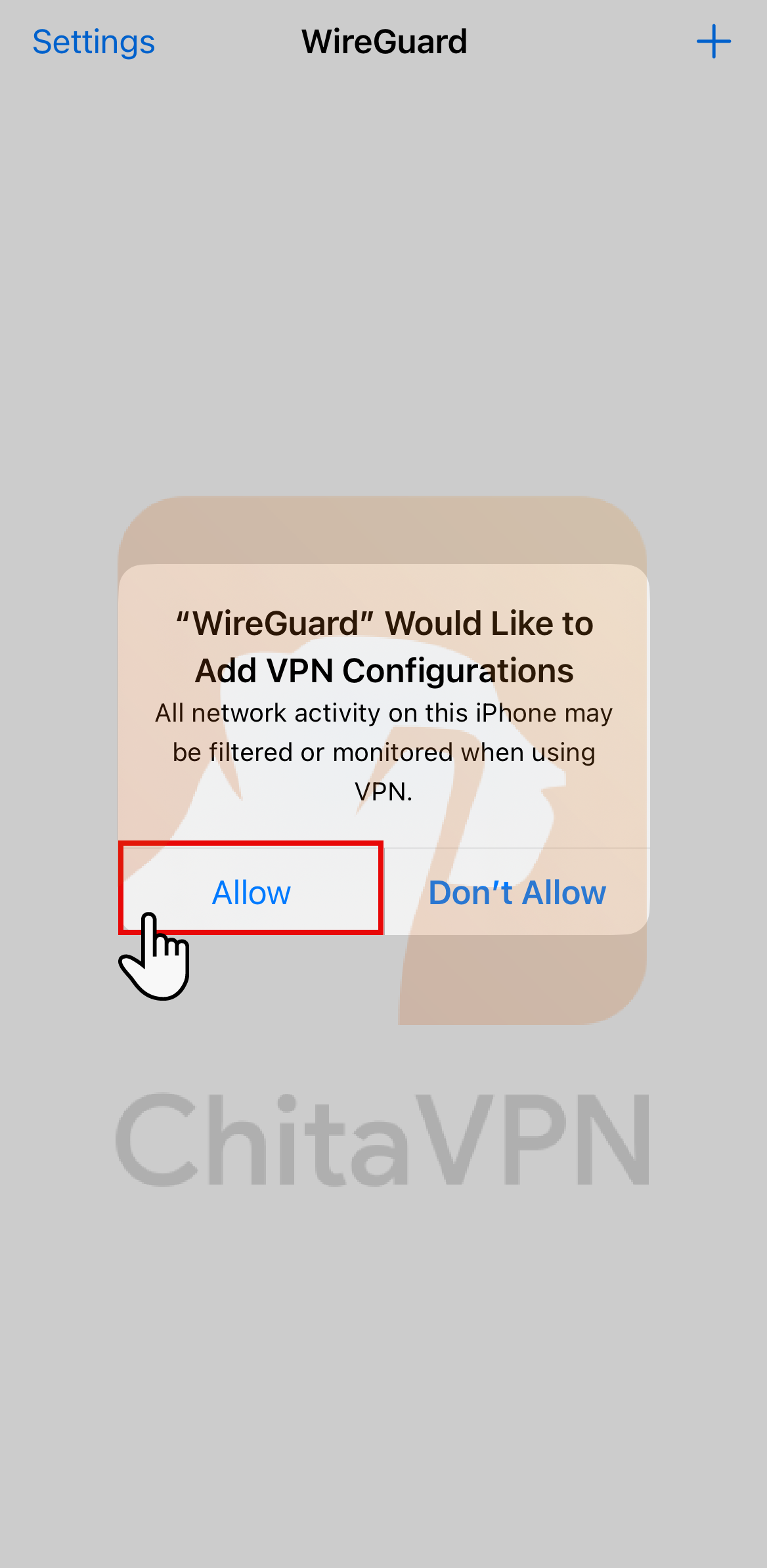 2. Select the ChitaVPN configuration file you downloaded to import it, then click on the "Allow" button to grant permission to add the VPN configuration.
