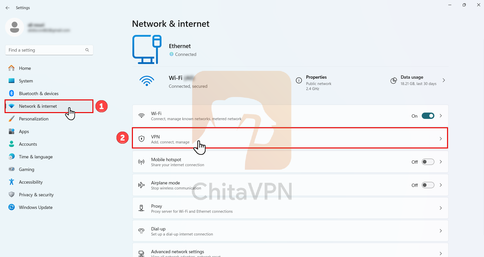 1. Click on settings icon or press Win+i to open your "Settings" and select the "Network & Internet" and "VPN" tab from the menu.