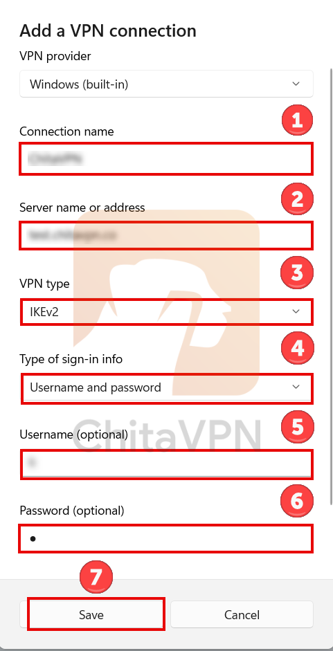 3. First, enter a name for your connection. Then, in the "Server Address" field, enter the ChitaVPN server address. For the VPN type, choose IKEv2. Under "Type of Sign-In Info," select "Username and Password," and enter your username and password. Finally, click "Save" to store the configuration.