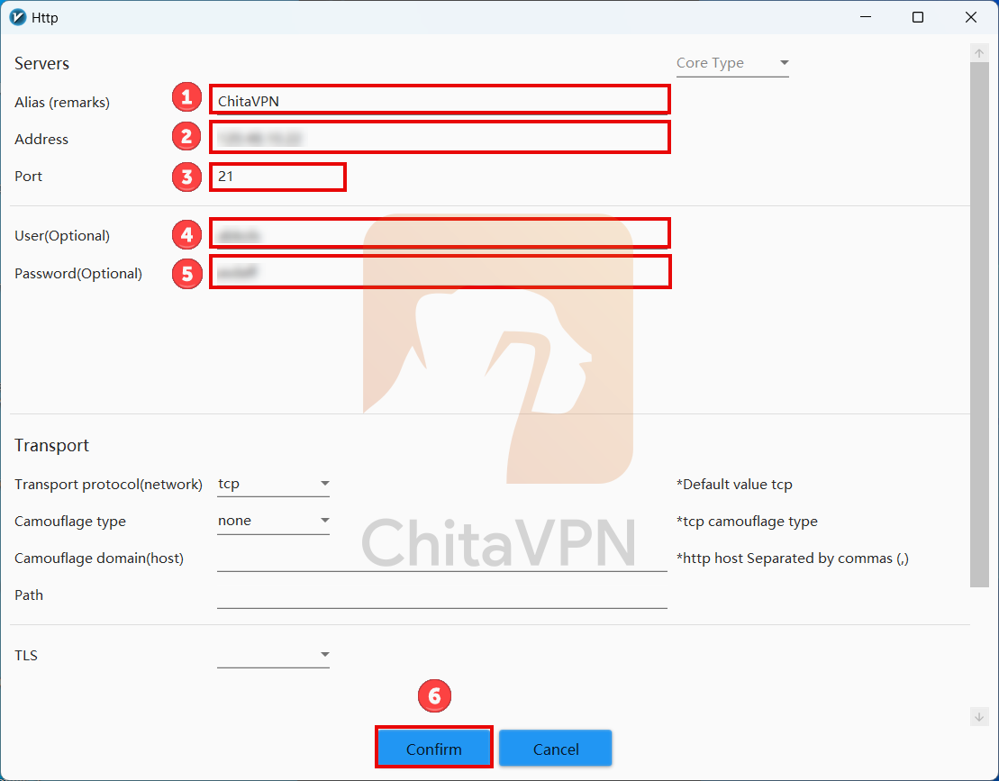 2. To add your connection, enter a name for your connection in the designated field. Next, input the ChitaVPN server address and the port number. Then, enter your username and password. Finally, click the "Confirm" button to establish the connection.