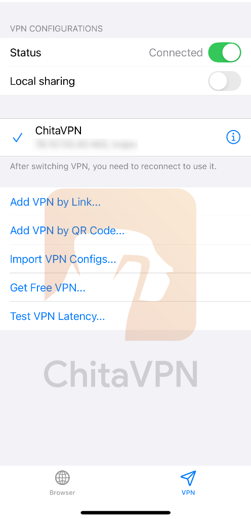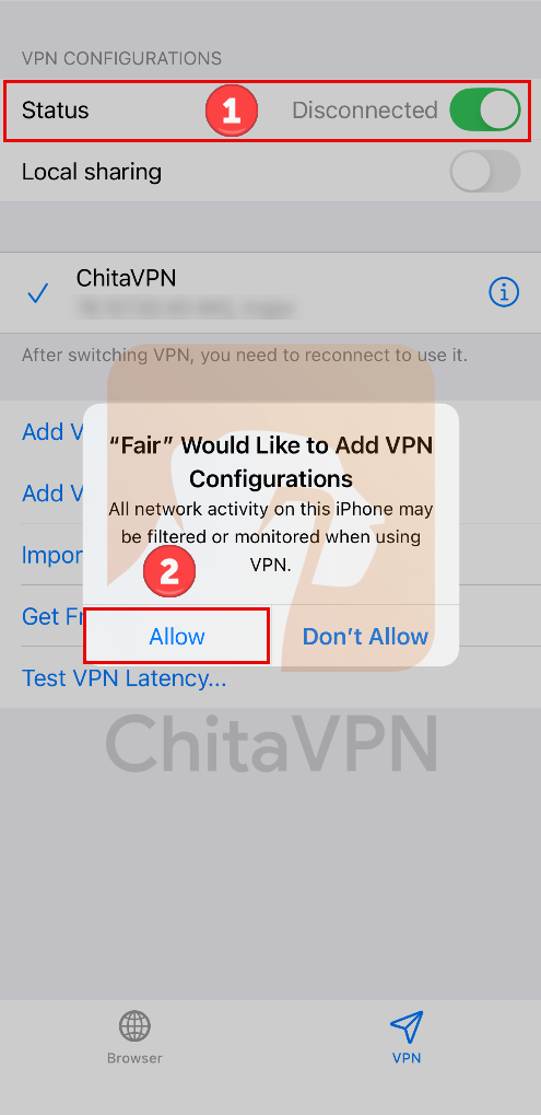 1. To add ChitaVPN config you need to click on the "VPN" icon in the bottom-right corner, then click on the "OK" button.