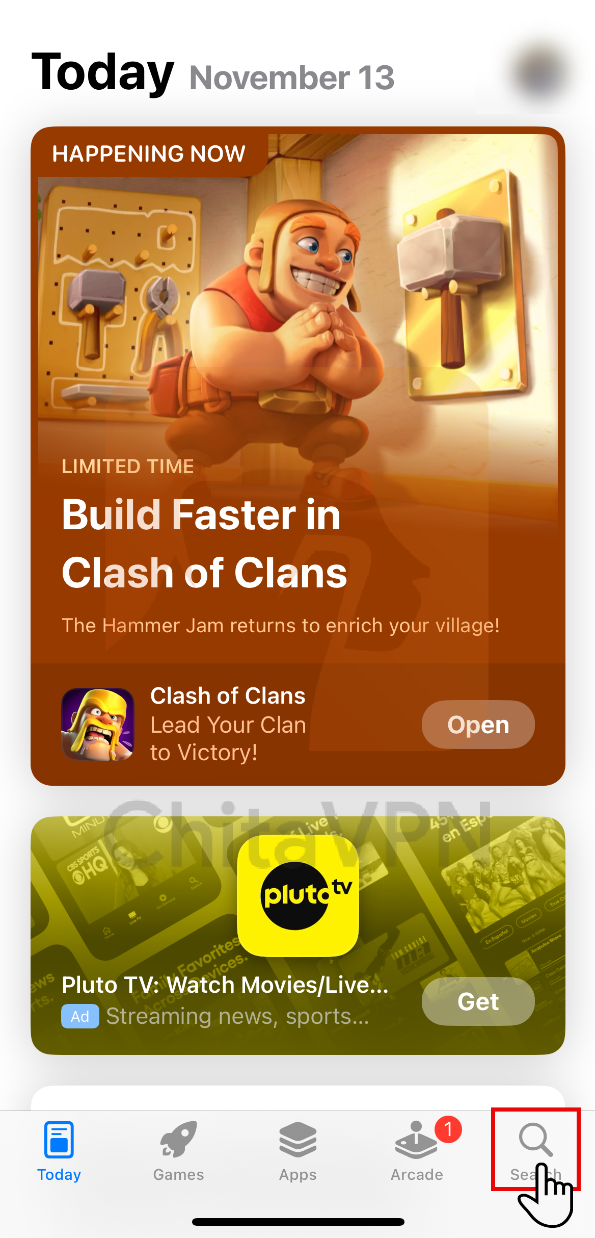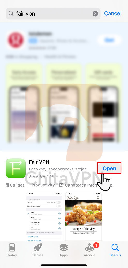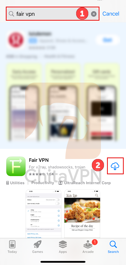 2. Click on the search icon, type "Fair VPN" in the search bar, and then click on the "Downlaod" icon, as shown in the picture below.