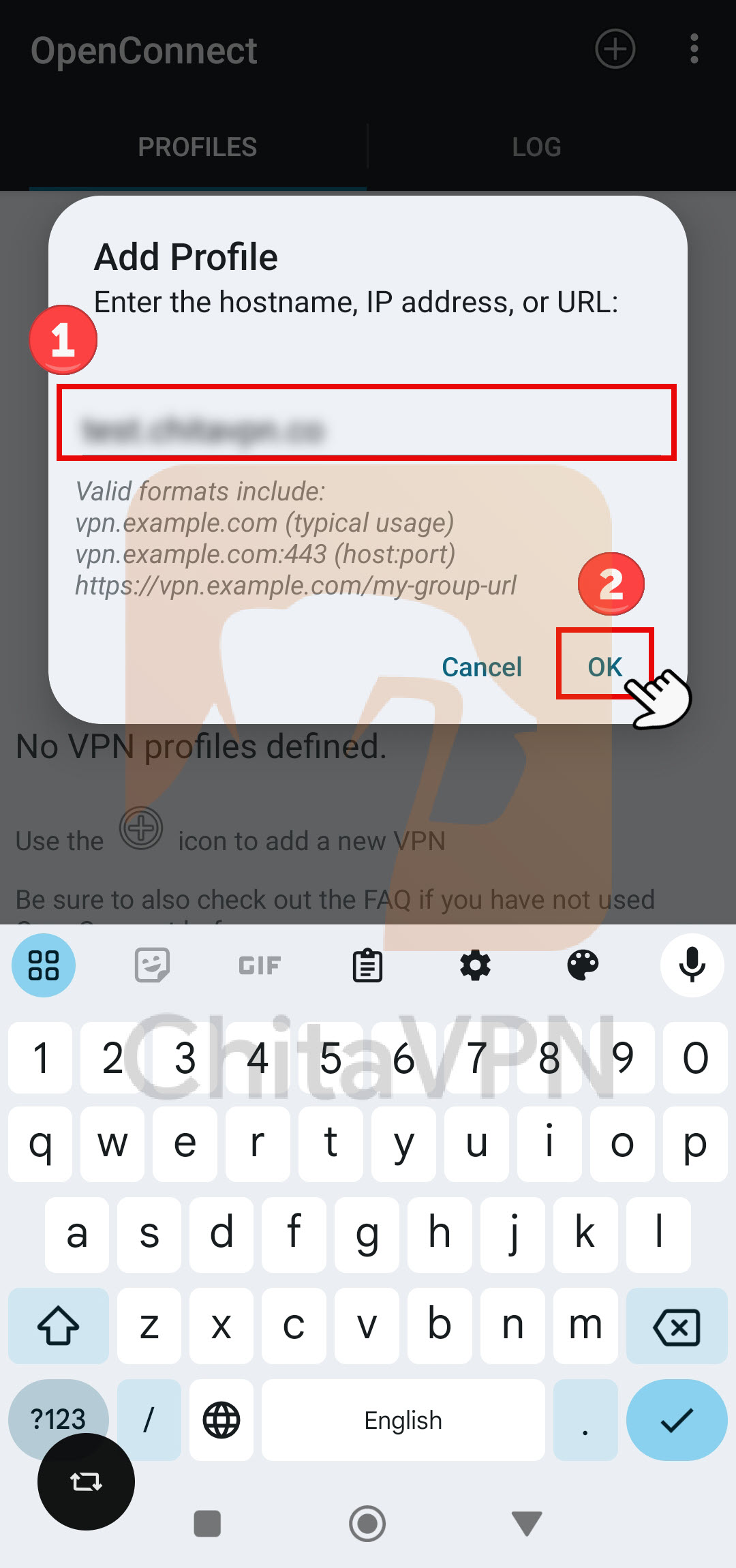 2. Enter the ChitaVPN server address and click the "OK" button.