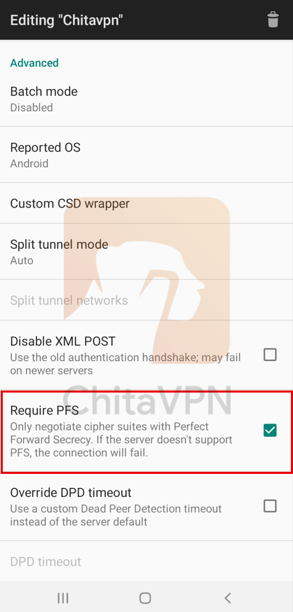 3. After adding the ChitaVPN server address, turn on the "Required PFS" (Perfect Forward Secrecy).