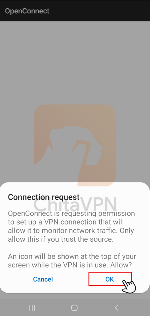 4. Select the added ChitaVPN connection and click "OK" to confirm the connection request.
